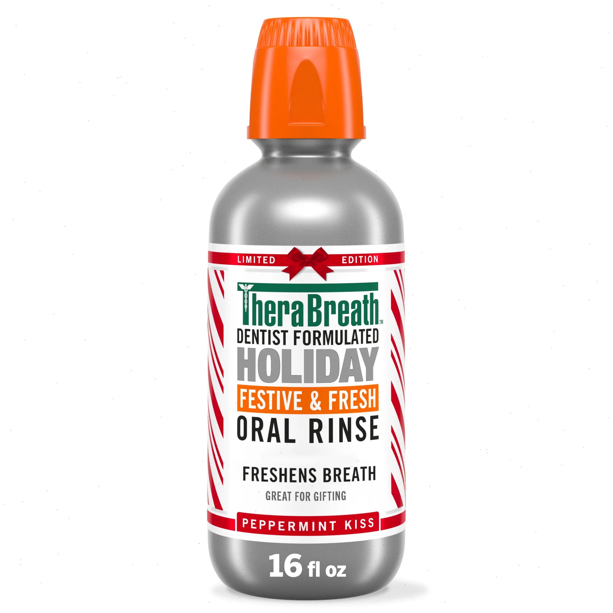 Enjoy fresh-breath confidence all cuffing season long with TheraBreath Festive & Fresh Oral Rinse. It’s your secret weapon for peppermint-perfect kisses, party-ready smiles, and mistletoe moments. This limited-edition rinse inspires you to Go Get Kissed, delivering fast-acting freshness with a crisp, cool Peppermint Kiss flavor that freshens breath. It’s gentle, non-burning, and festive enough to gift, share, or stash in your own stocking. TheraBreath formulas are paraben-free, alcohol-free, and free from colors and dyes. They’re also certified vegan, gluten-free, kosher, halal, and packaged in a BPA-free bottle. TheraBreath Rinses are always backed by our 100% guarantee. If you’re not satisfied, contact us within 30 days of purchase for a full refund.